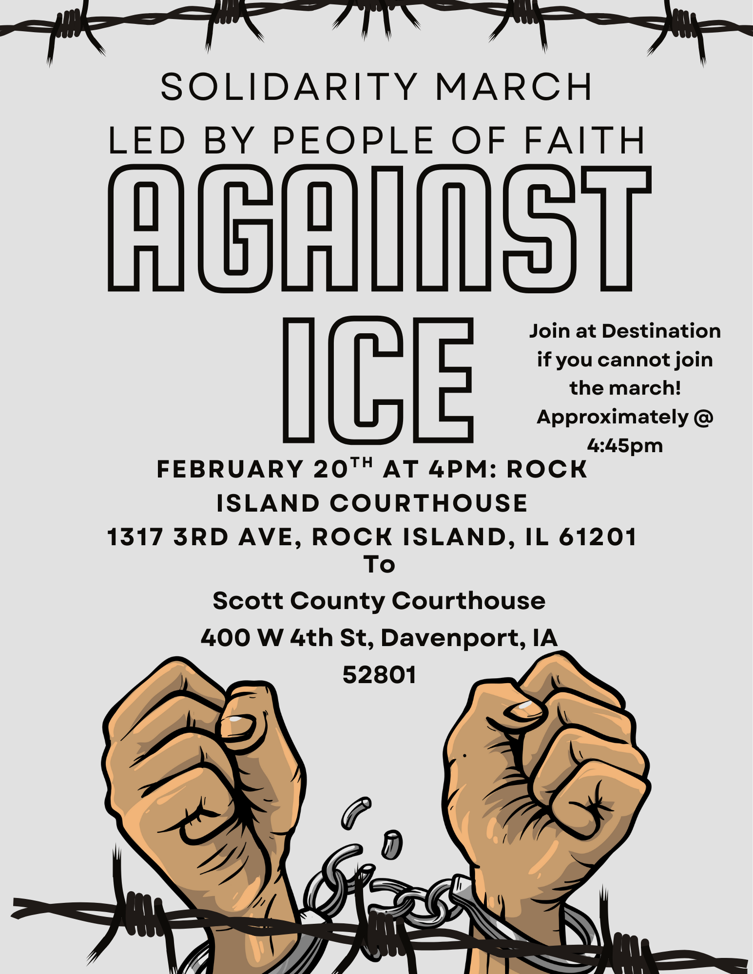 The march begins at 4 p.m. at the Rock Island Courthouse and will proceed over the Centennial Bridge to the Scott County Courthouse (by approx. 4:45). Feel free to join the march along the way if you're unable to begin at the RICO Courthouse.