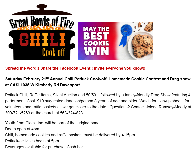 We continue to volunteer for River Bend. We sort donations and pack them in boxes destined for food pantries at the main warehouse, 4010 Kimmel Dr, Davenport. We crank the tunes and have a great time. Thanks to a regular core group of volunteers, we're in a position to make a long-term commitment for this valuable and rewarding need. Here's a list of upcoming opportunities:
